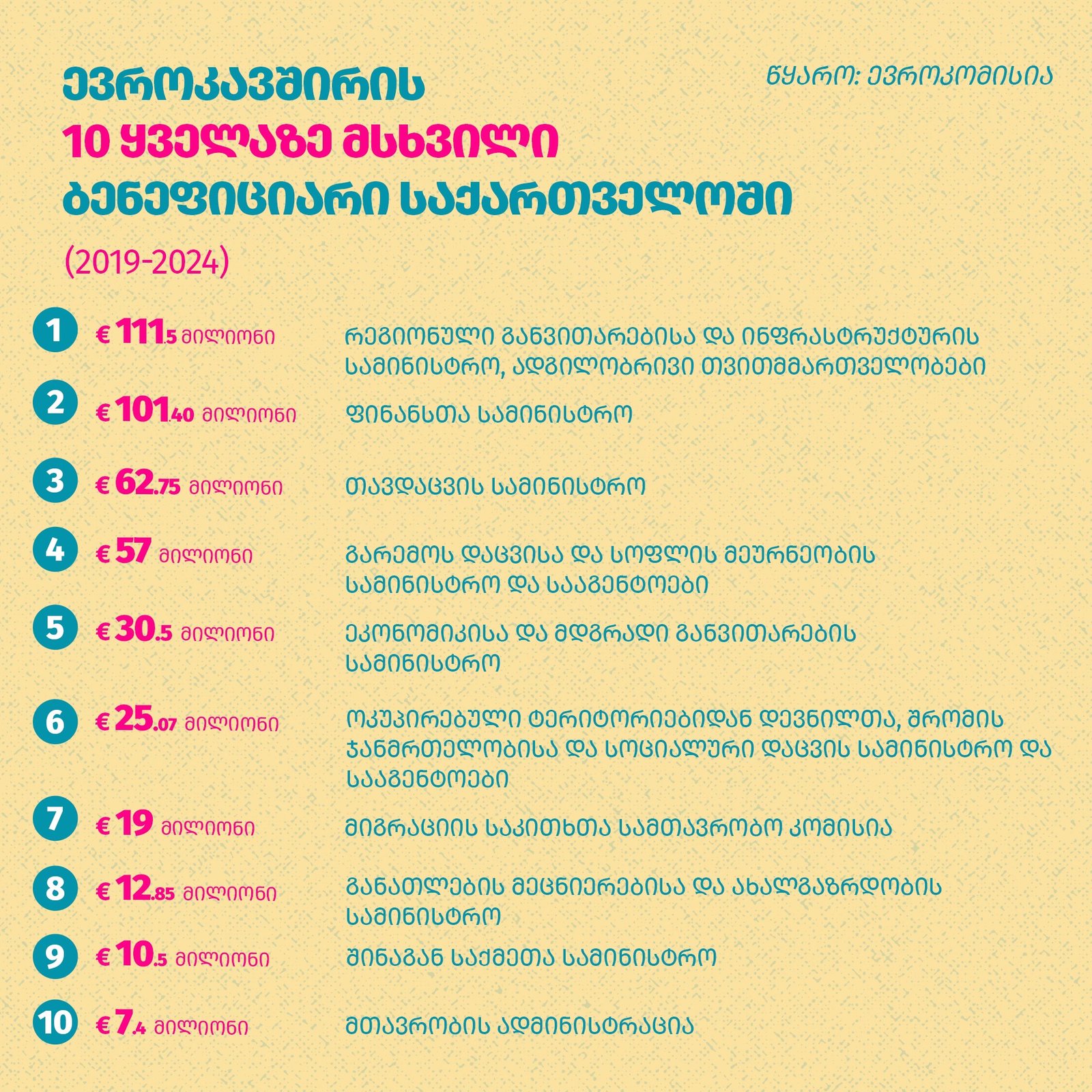 მმართველი პარტიის პროპაგანდა ცდილობს საქართველოს დასავლელი პარტნიორების მხრიდან მომდინარე დაფინანსება გაუმჭვირვალედ და ქვეყნის ინტერესების საწინააღმდეგოდ წარმოაჩინოს. რეალურად, ევროკავშირის დაფინანსების ყველაზე დიდი მიმღები საქართველოს მთავრობა და სახელმწიფო ინსტიტუტებია. ევროკავშირისგან სამთავრობო უწყებების მიერ მიღებული დაფინანსება 11-ჯერ აღემატება სამოქალაქო სახოგადოების მიერ მიღებულ დაფინანსებას.